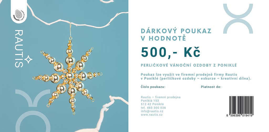 Tento poukaz slouží na nákup ozdob, materiálu, hobby setů, vstupenek na exkurzi, na vyžití v kreativní dílně pro veřejnost v naší prodejně v Poniklé. Poukaz má platnost jeden rok od nakoupení. Poukaz nelze vyčerpat postupně. Na poukaz nelze v prodejně vracet peníze na jeho nevyčerpanou část. Poukaz je označen číslem, razítkem a podpisem.